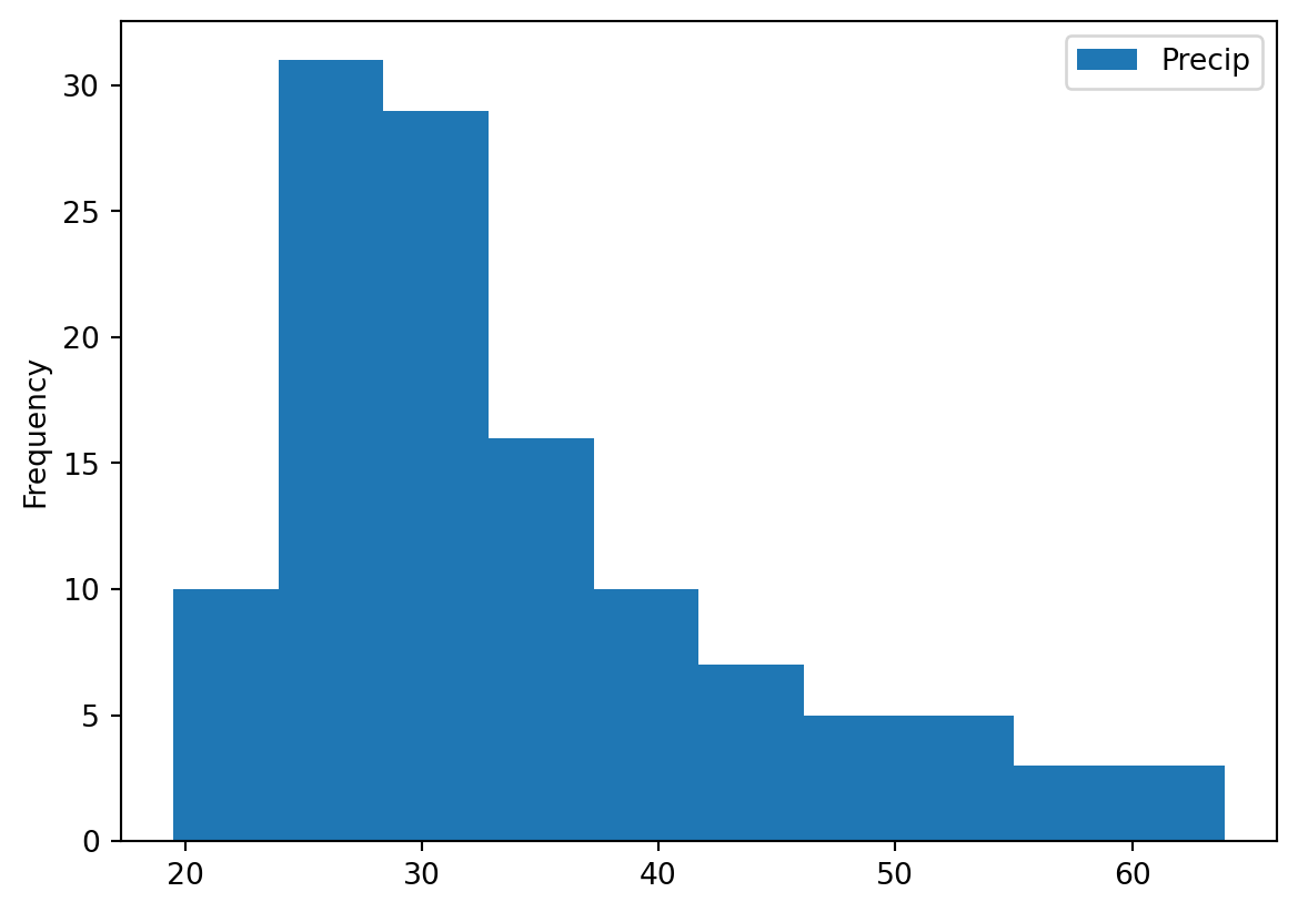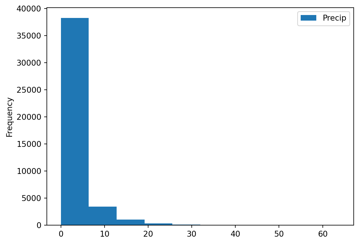stats.shapiro(Precip)/home/runner/.local/lib/python3.12/site-packages/scipy/stats/_axis_nan_policy.py:592: UserWarning: scipy.stats.shapiro: For N > 5000, computed p-value may not be accurate. Current N is 43241.