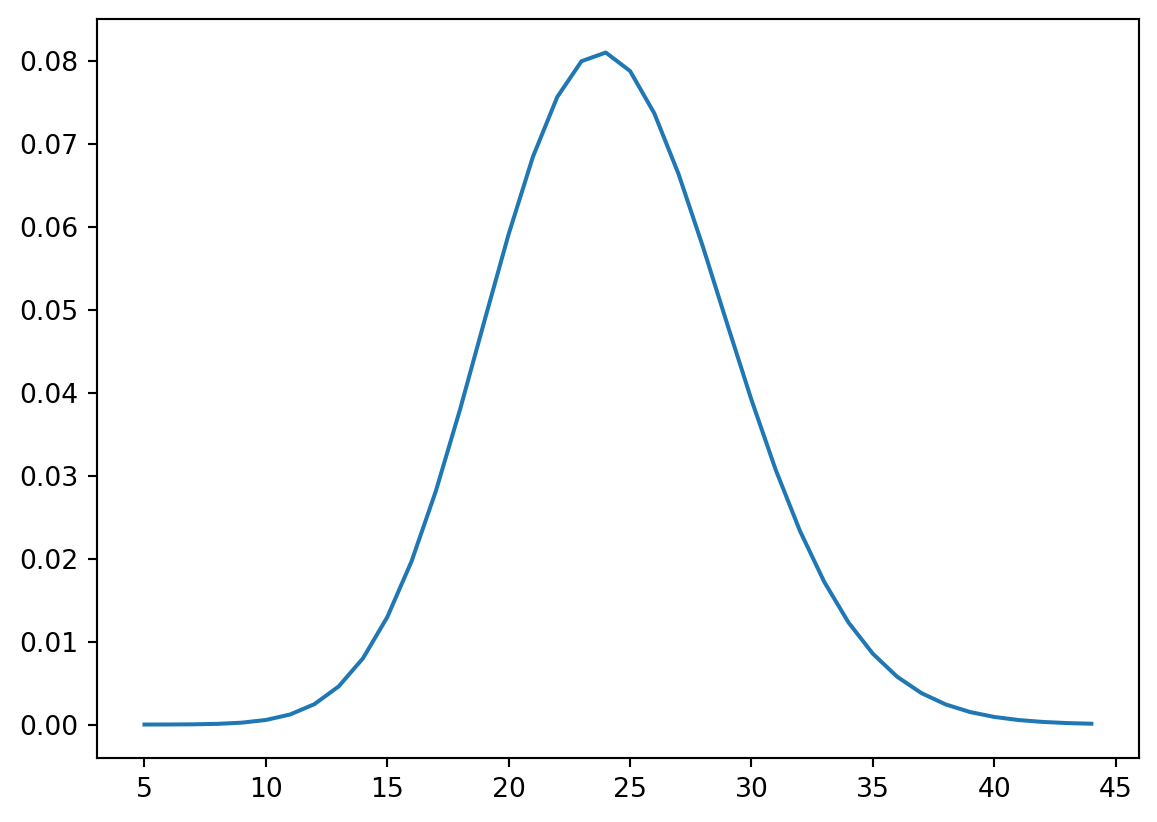 x = np.arange(5,45)