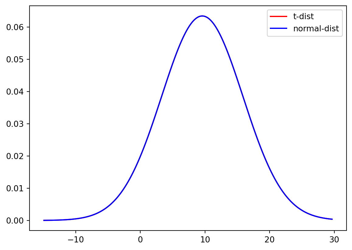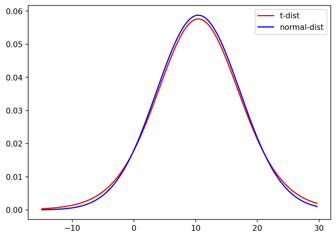 We can now use both the normal and t-distribution for the Temperature dataset with the fitting information from Question 12. We first fit both a t-distribution with a limited sample and a normal distribution and then plot the probability density function (PDF) for both distributions.