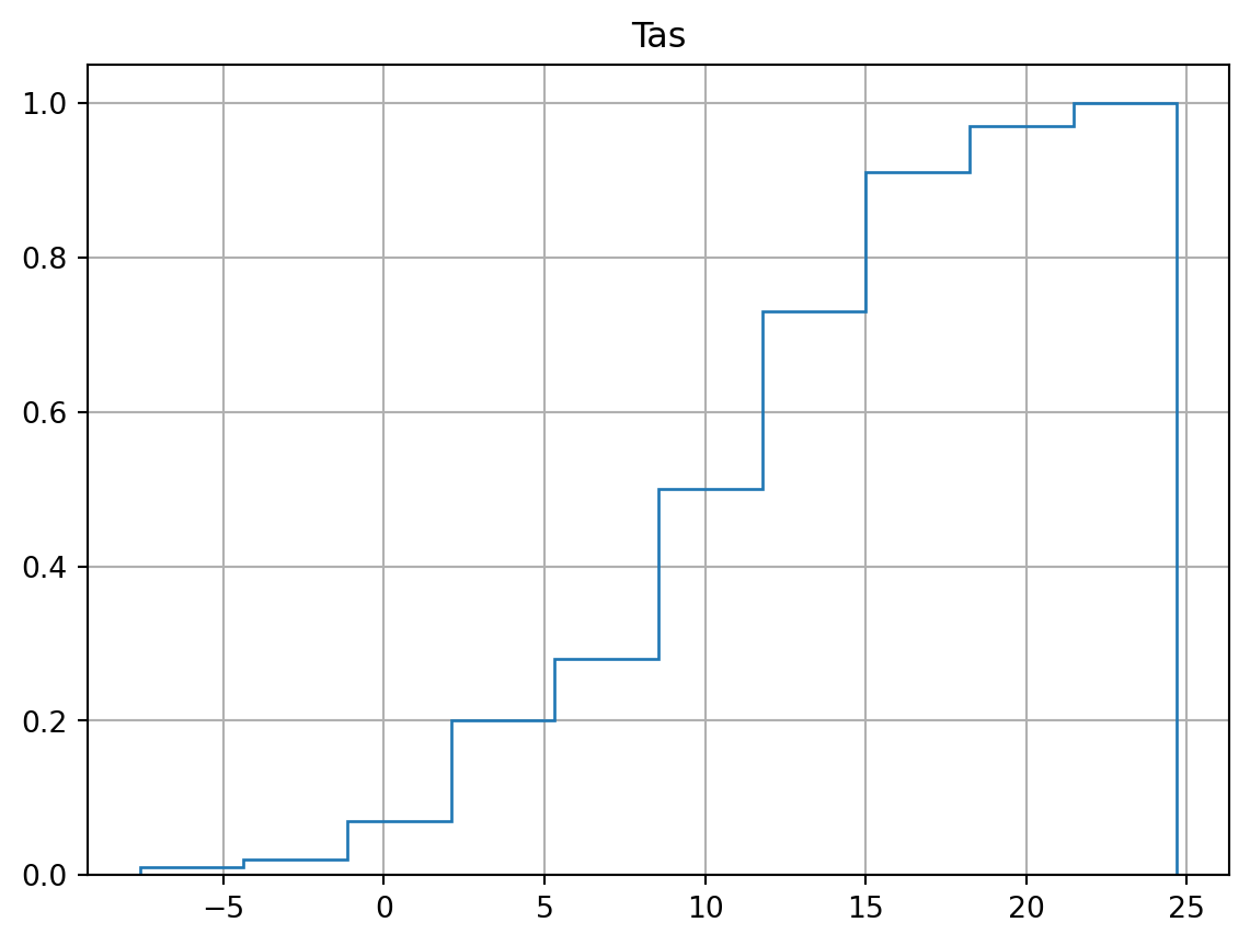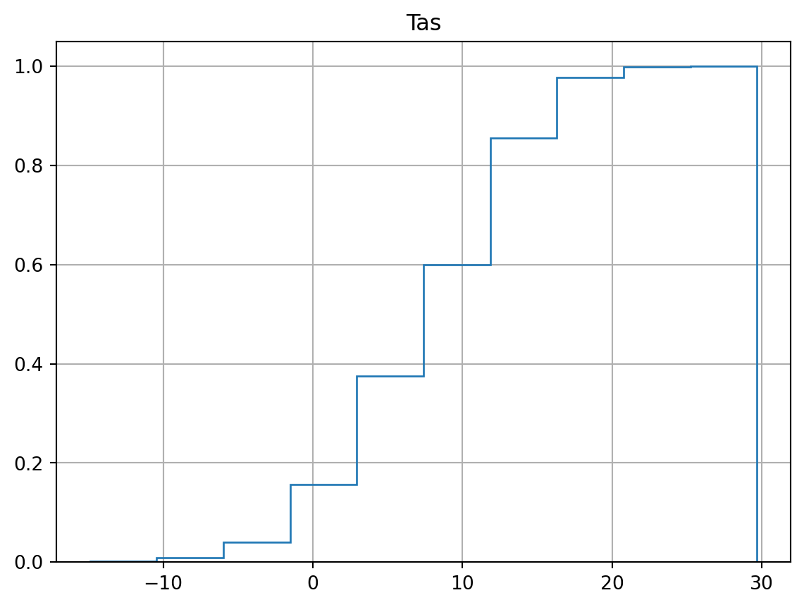 Tas.hist(cumulative=True, density=True, histtype='step',label="Full set")array([[<Axes: title={'center': 'Tas'}>]], dtype=object)