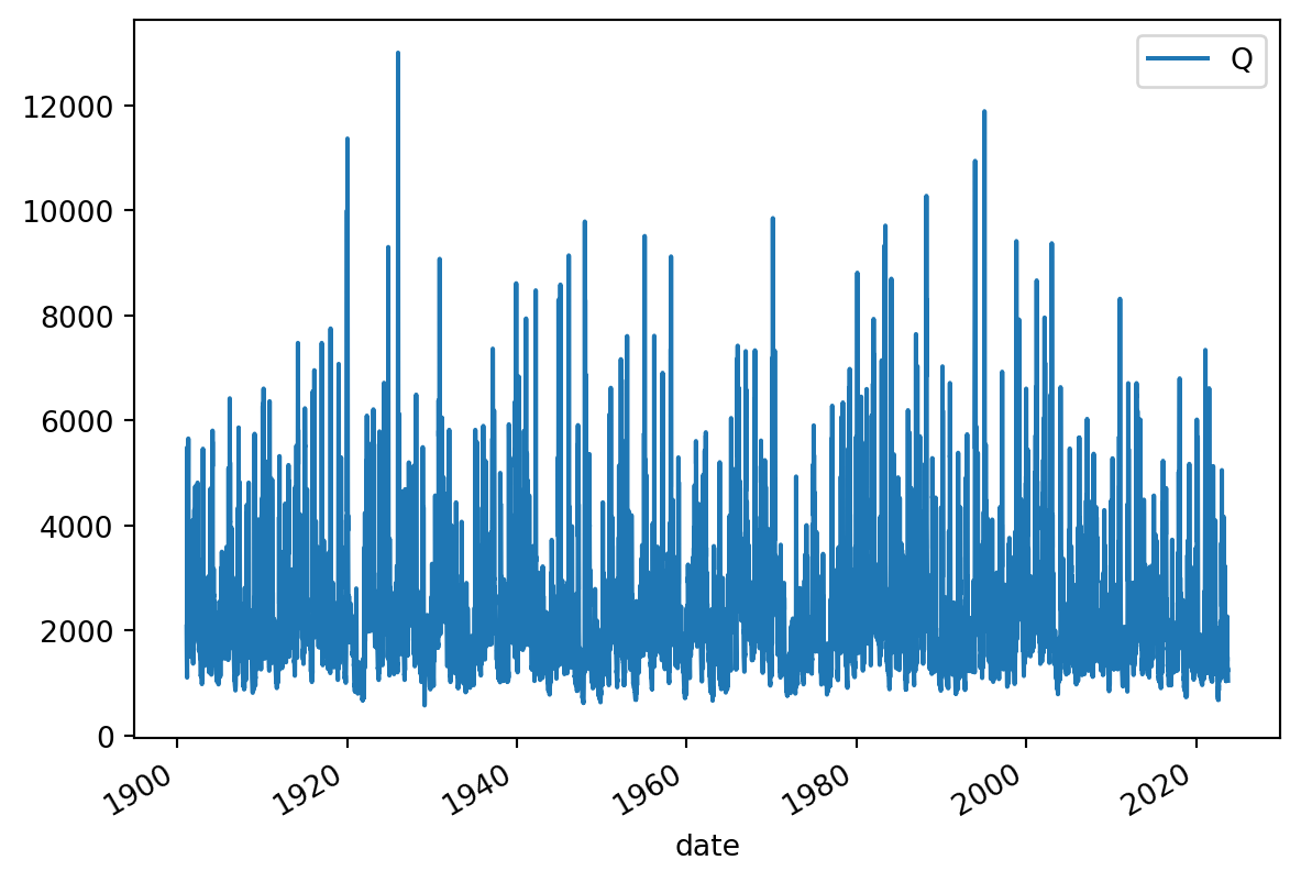 Q = pd.read_csv("../Data/dailyDischarge.csv", parse_dates=True, index_col=0).dropna()You have loaded the daily discharge data for the Rhine river, now start and exploring. You should make the following things: