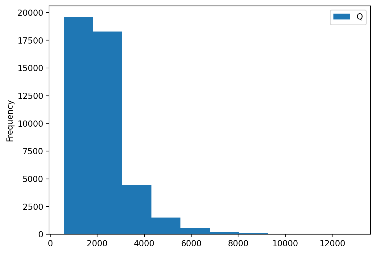 stats.describe(Q)DescribeResult(nobs=np.int64(44771), minmax=(array([575.]), array([13000.])), mean=array([2200.07870753]), variance=array([1270596.22239363]), skewness=array([2.10692705]), kurtosis=array([6.9744782]))