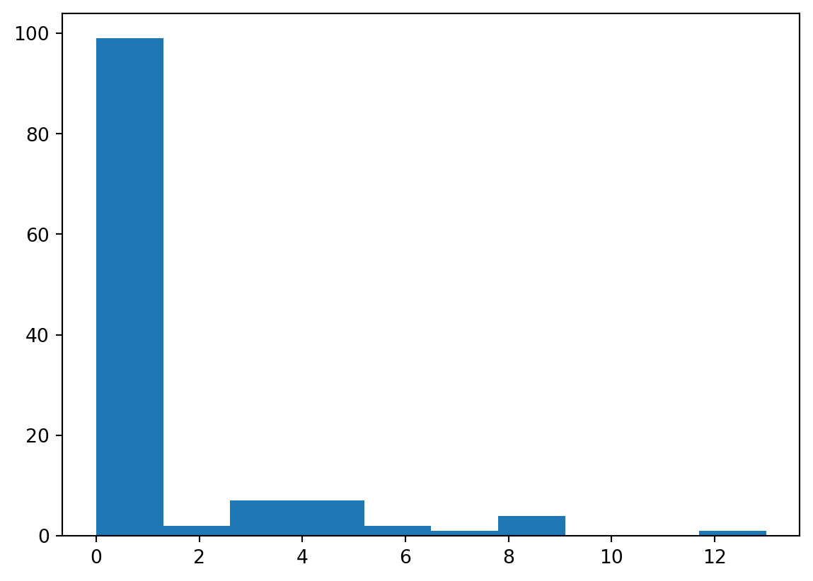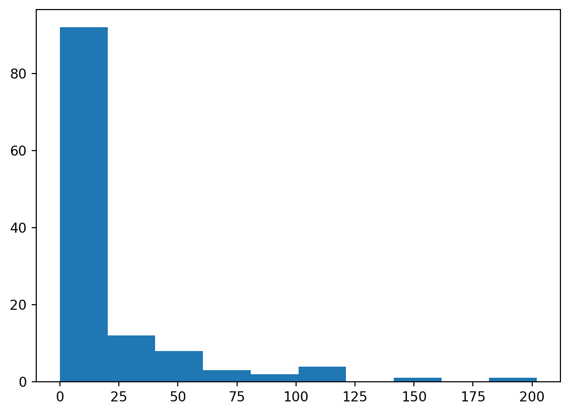 (array([92., 12., 8., 3., 2., 4., 0., 1., 0., 1.]),