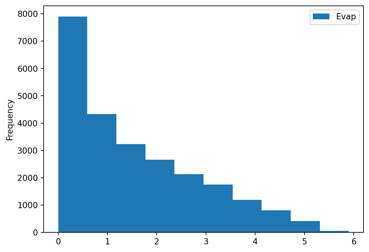 stats.shapiro(Evap)/home/runner/.local/lib/python3.12/site-packages/scipy/stats/_axis_nan_policy.py:592: UserWarning: scipy.stats.shapiro: For N > 5000, computed p-value may not be accurate. Current N is 24462.
