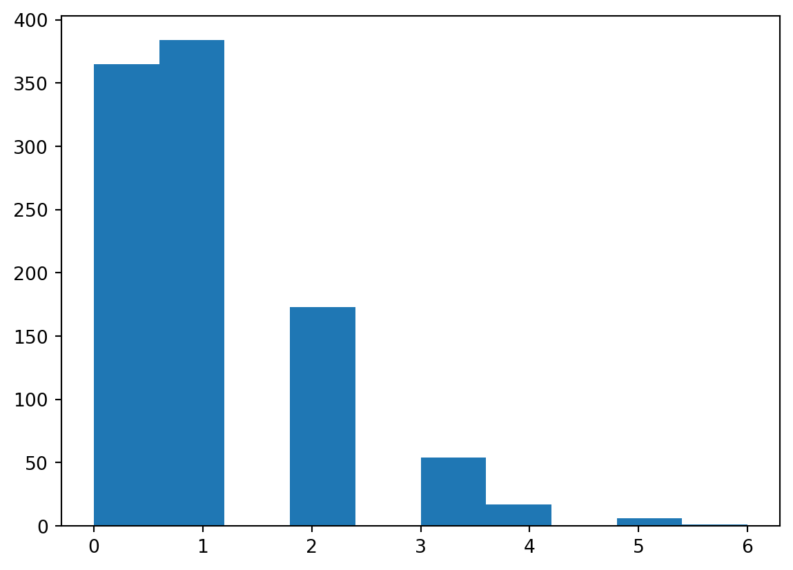 plt.hist(randomYears)(array([365., 384., 0., 173., 0., 54., 17., 0., 6., 1.]),
