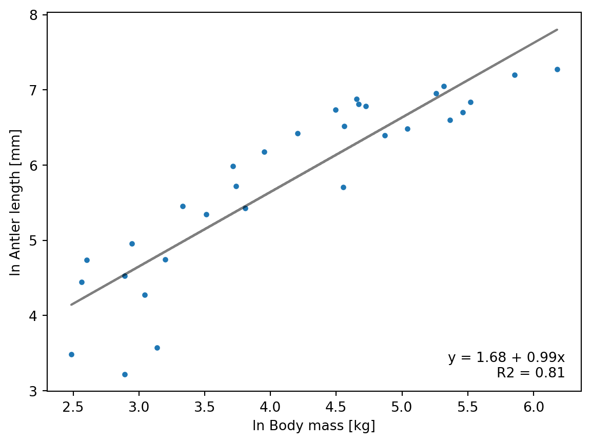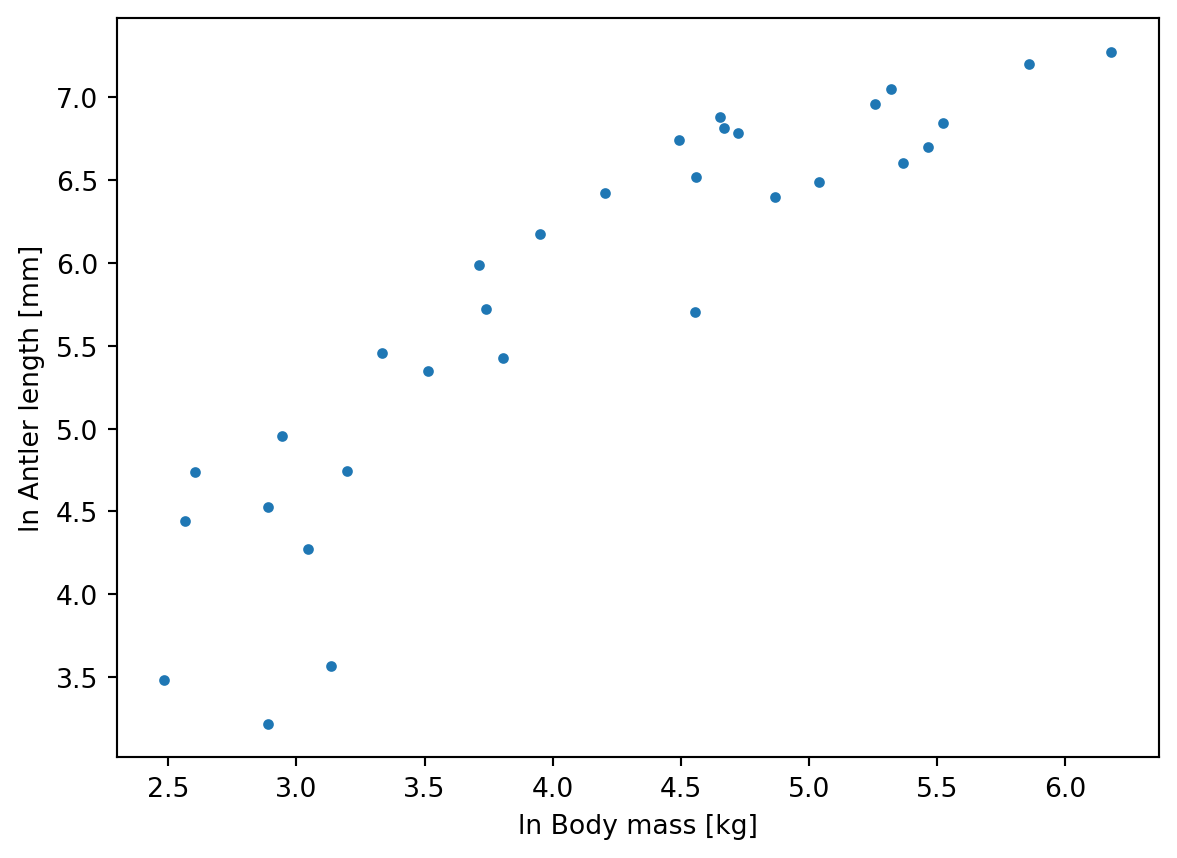 n = antlers.shape[0]To shorten the code and keep variable naming consistent with the equations above, let’s refer to the predictor variable (ln body mass) as x and the response variable (ln antler length) as y: