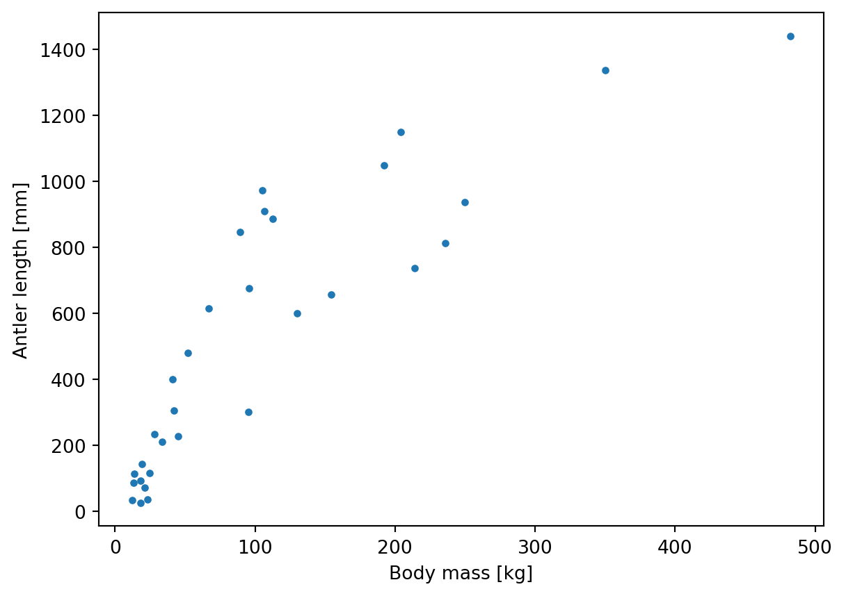 antlers = pd.read_csv('../Data/Antler_allometry.csv')Preview the data: