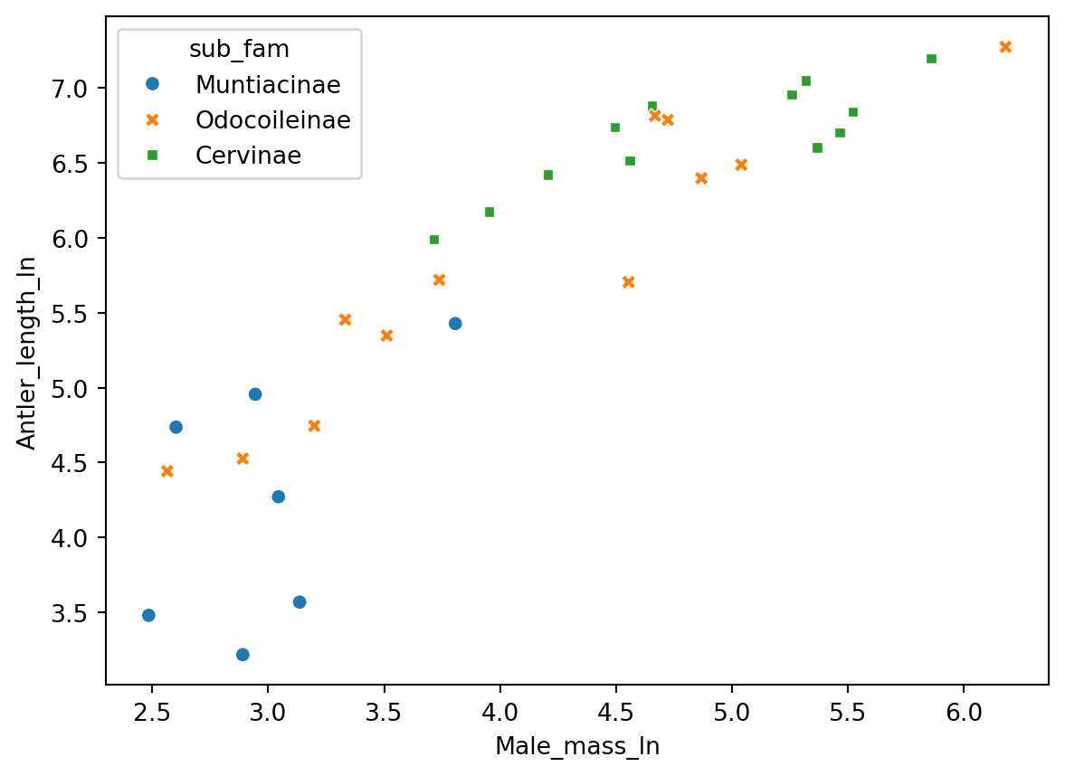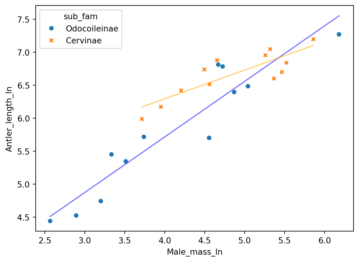 antlers_fltr = antlers[antlers["sub_fam"] != "Muntiacinae"]# run regression on the filtered data