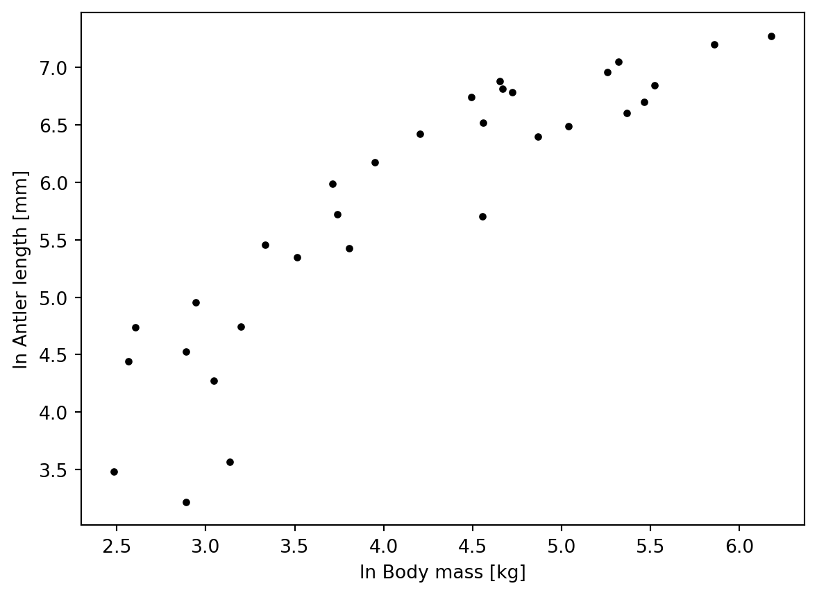 ax.plot(antlers.Male_mass_ln, antlers.Antler_length_ln, '.', color='k')