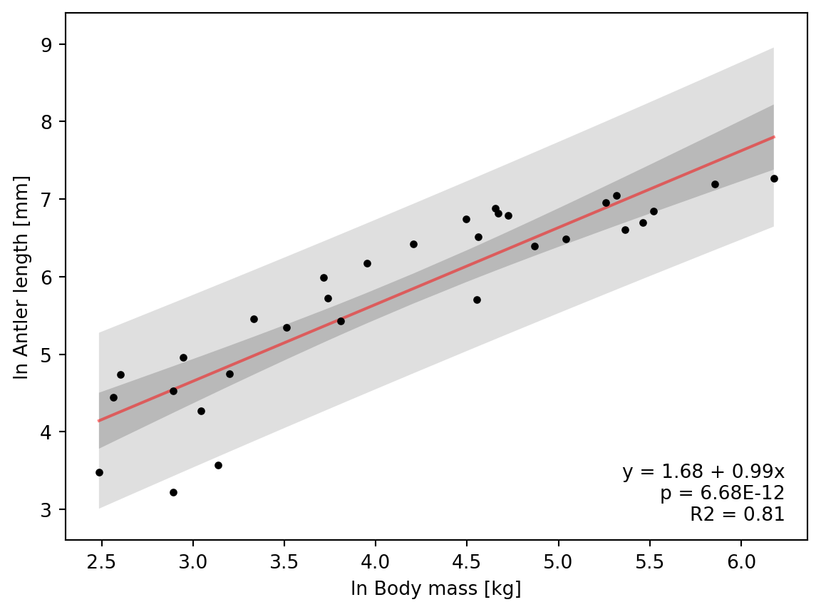 In the previous exercise, you have transformed the data set of antler lengths for the Irish elk (Plard et al., 2011) to remove skew from the distribution using a natural logarithm, calculated the regression line, and assessed the goodness of fit. But how good is the fit really? Was linear regression a valid approach to use for these data? Can we statistically answer the question: is deer body mass related to antler length?