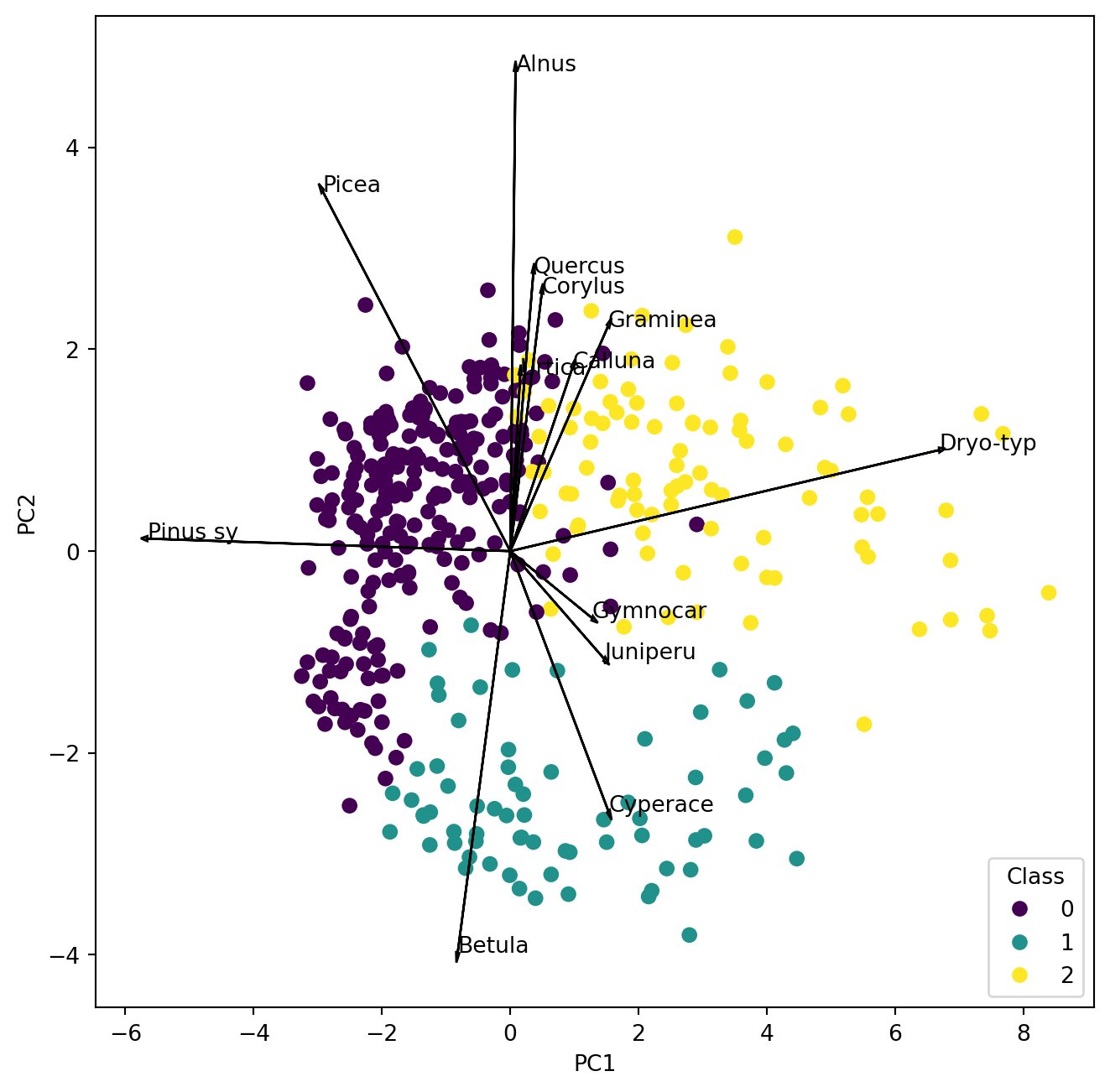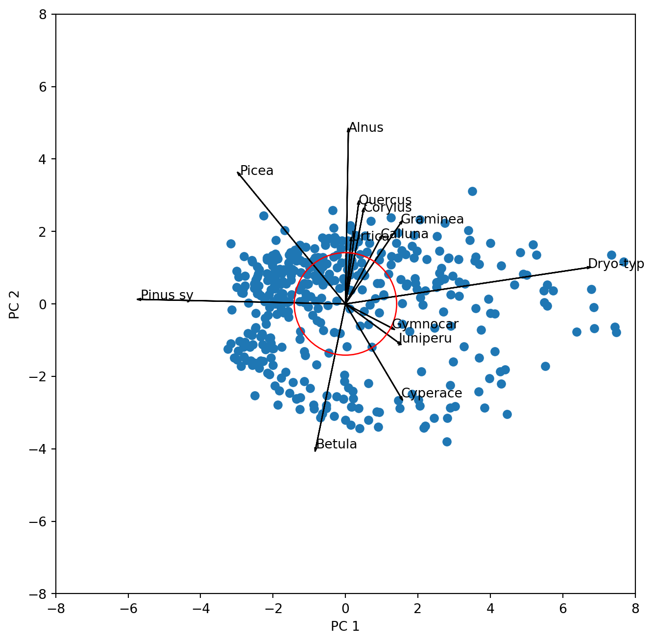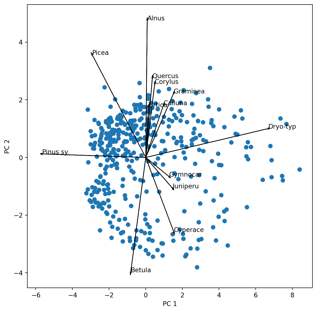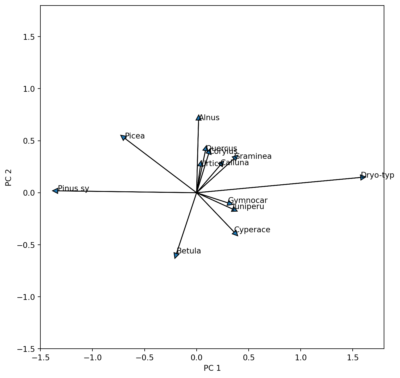 The vectors for Pinus and Dryopteris-type type are parallel to the PC 1 and thus describe the largest gradient in the samples. Alnus and Betula are the dominating taxa on PC 2 pointing in opposing directions.