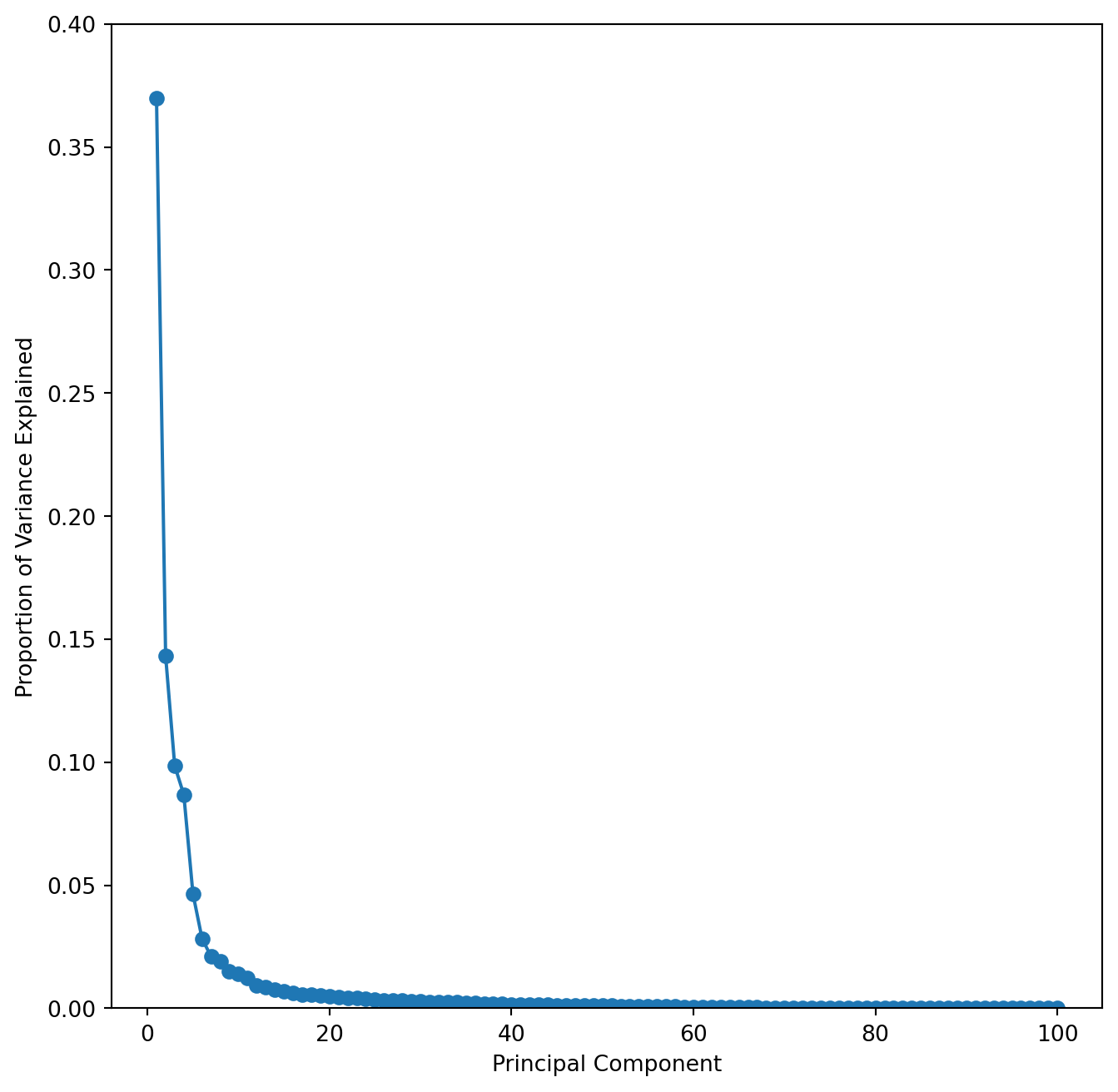 poll_pca.explained_variance_ratio_[0:10] # Here we only look at the first 10 PCsarray([0.36990526, 0.14321587, 0.09855086, 0.08679366, 0.04661818,