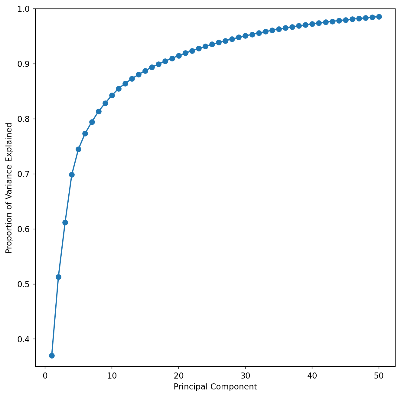 To get a better look at this and also to estimate the position of the elbow it is useful to plot the cumulative variance explained for the first 50 PC’s. You can modify the above code, but may want to set the y-axis limits to 0.35 and 1.