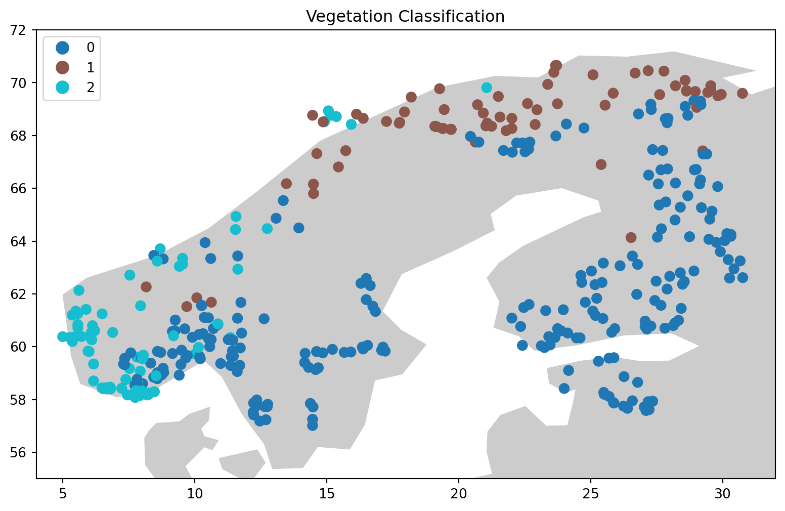 Samples assigned to cluster 1 are located in northernmost Fennoscandia as well as in the Scandinavian mountains. Samples are characterized by Betula (berk) which is forming the northern as well as in many places the altitudinal tree-line. Cyperaceae (cypergrassenfamilie) pollen also indicates open vegetation types found near and beyond the forest limit.