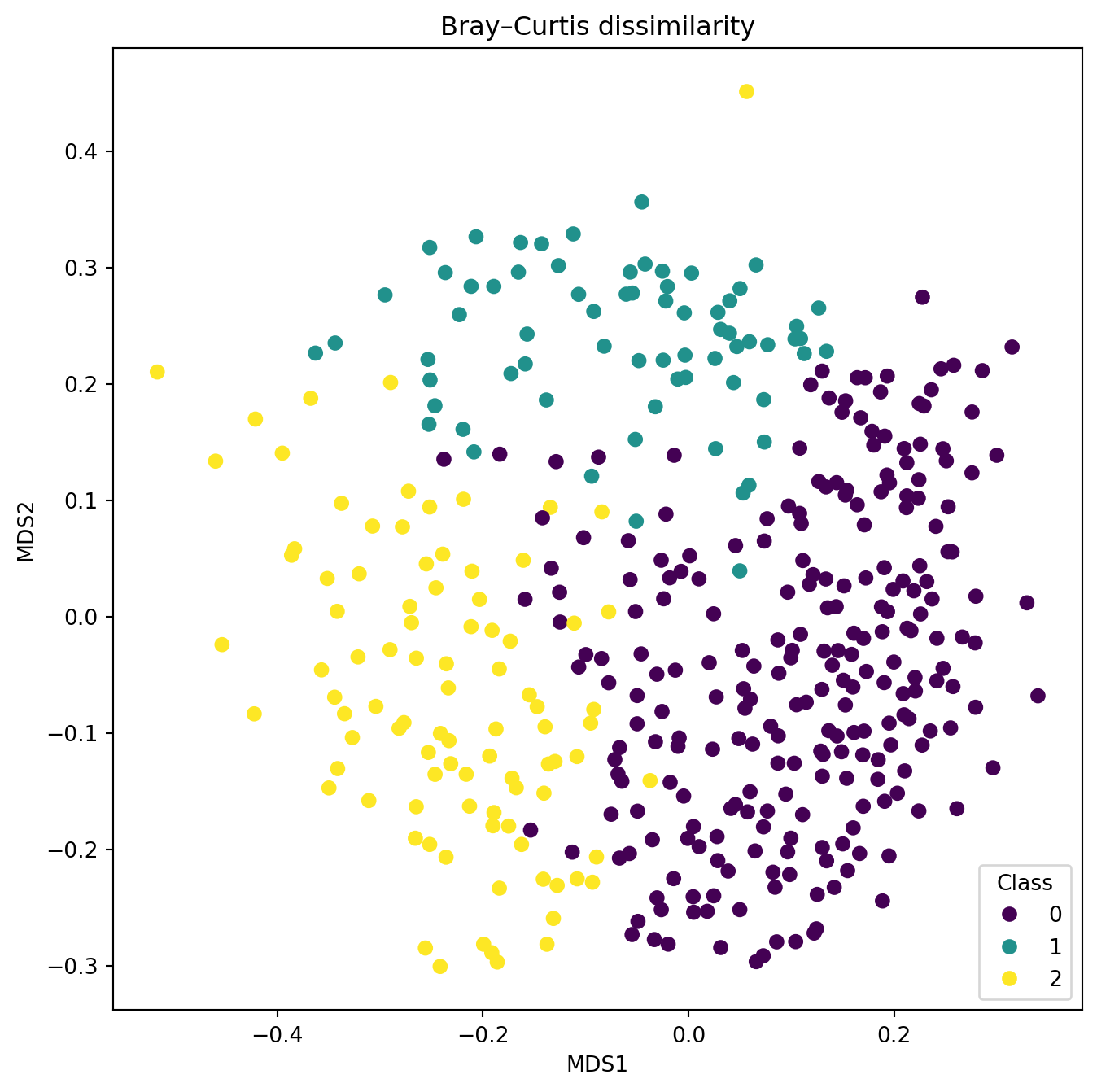 Metric multi-dimensional scaling is available from ‘scikit-learn’ which also claims to do the non-metric variant. However, testing it only yielded interpretable results for metric scaling so we will have a quick look at what that does. It is not an eigenvector method and we can use it with pre-computed dissimilarities. Thus we go back to the SciPy package where we had a good choice of dissimilarities to see how they may influence the ordination of samples.
