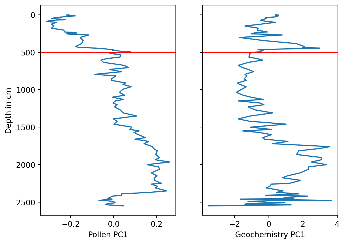 Tchem_s = Tchem[["Fe","Ca","Al","Mg","Mn","P","org"]]You want to compare the trends in both datasets: Asking the question if changes in the lake catchment recorded by the pollen composition may have lead to changes in the lake itself recorded by the sediment chemistry? Both datasets are multivariate thus the best way to compare them is to reduce the dimensions and only compare the first principal axes scores for the samples. Don’t forget that one or the other dataset needs standardisation or transformation prior to PCA. Please also report how much variance is explained by the respective first PC.