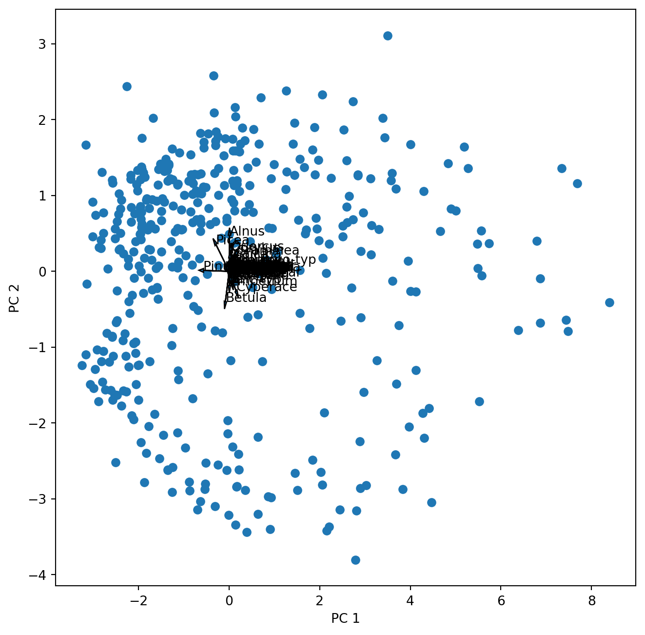 poll_sq = poll_surf.apply(np.sqrt)PCA of the pollen data from Scandinavia