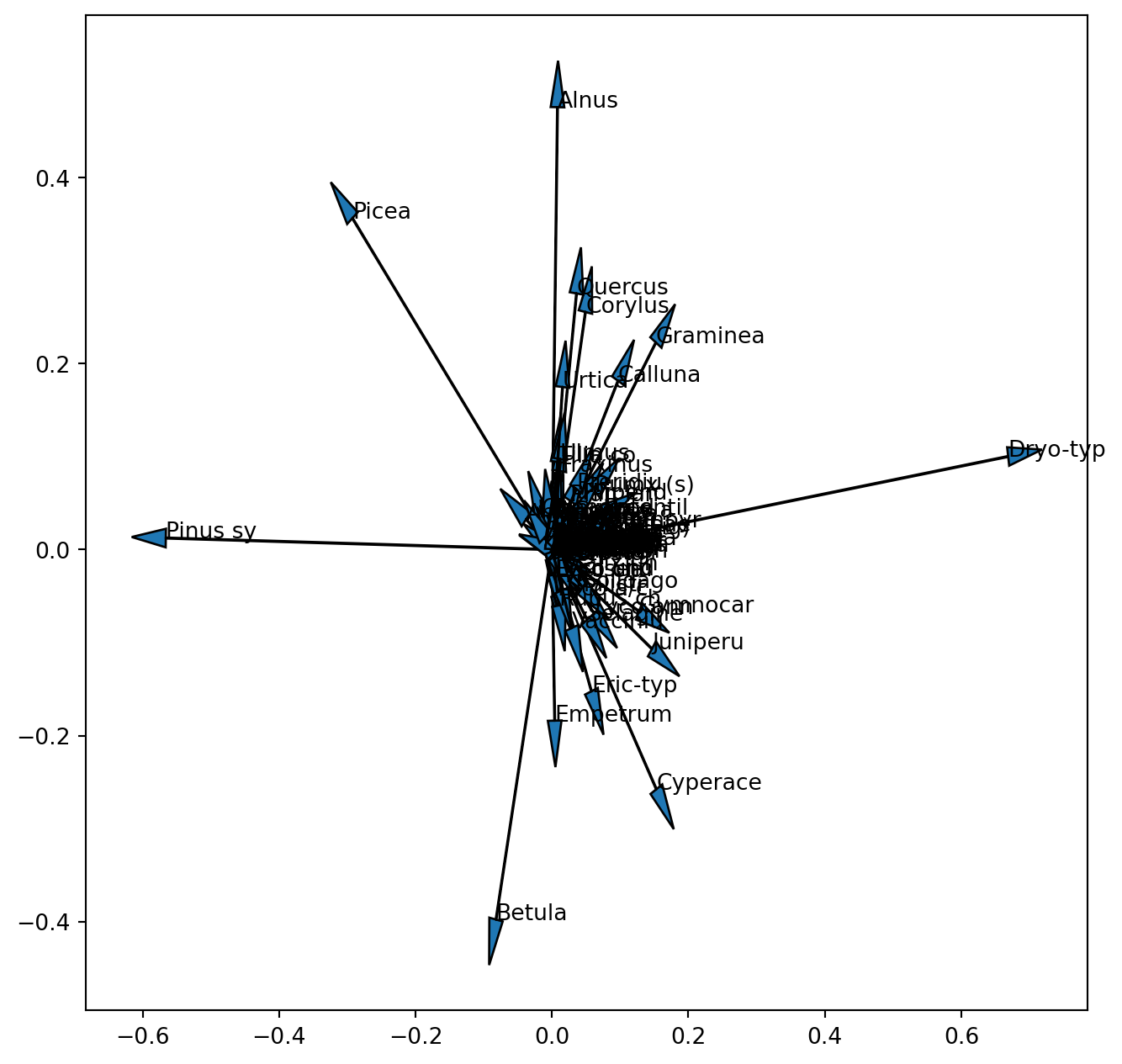 select = [i for i, val in enumerate(index) if val]The resulting list of selected pollen taxa can be used in the plotting of the vectors. Thus our selection only affects the plot but not the analysis. We also learned that we need to scale one or both of the components in order to make the plot more readable. Thus we introduce a scale factor for the vectors.