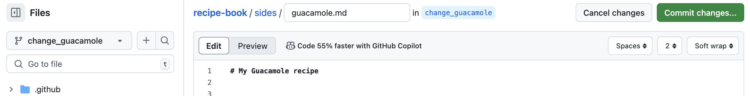 Create a branch “change_guacamole” from the main branch in the web interface of your remote recipe repository and edit in this branch the first line of the Guacamole recipe and commit it: